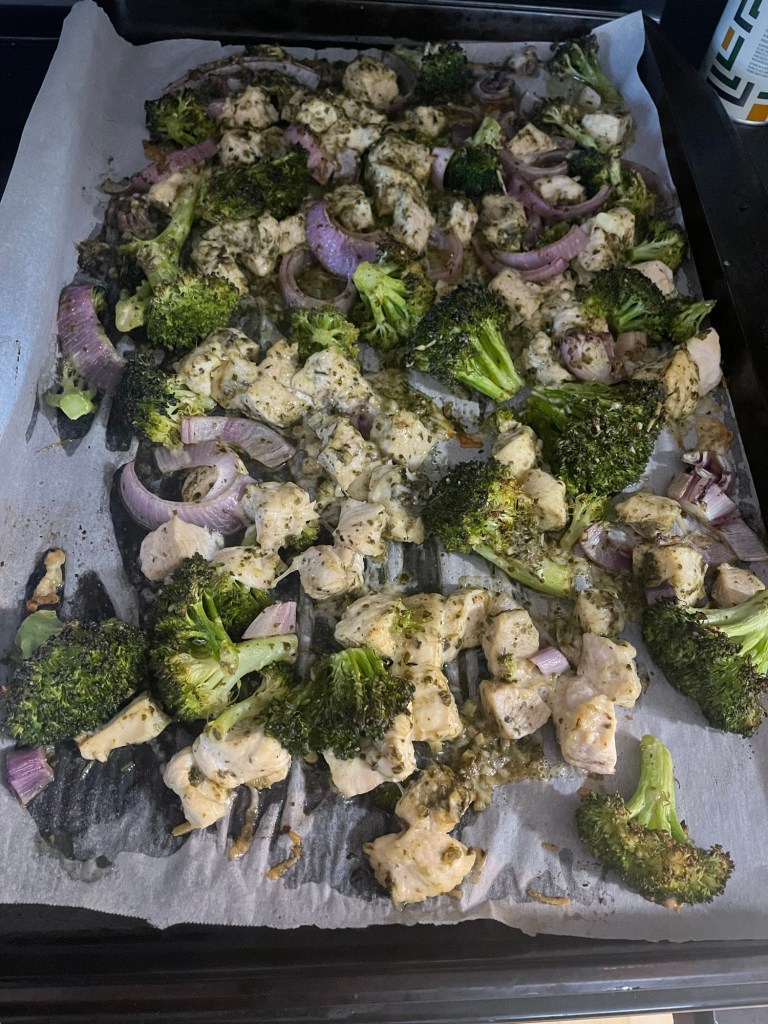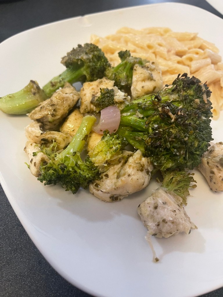 Pre-heat your oven to 400 degrees and line a large baking sheet with parchment paper or foil. Toss the chicken, broccoli, red onion, and parmesan together and spread over the pan evenly. In a small bowl, mix the pesto, oil, and seasonings. Pour the mixture over the baking sheet and toss everything together. Roast for twenty minutes or so, until the chicken is cooked through. You can serve this so many ways, but we had it with mini penne and it was just perfect. This yielded 5 large servings.