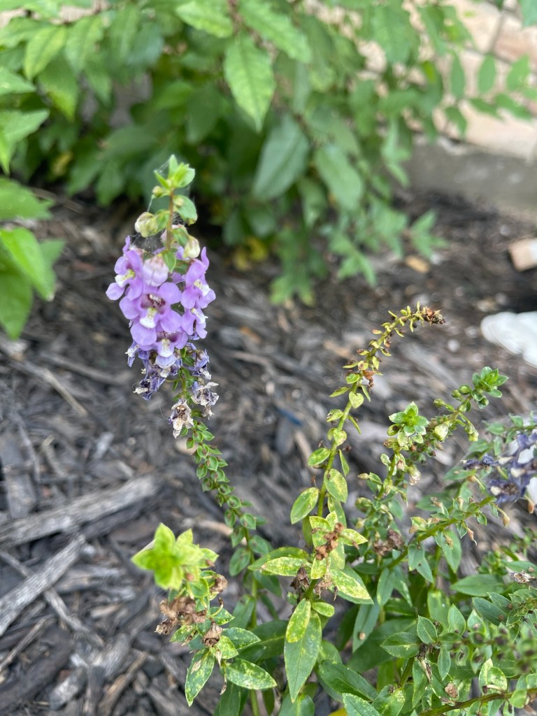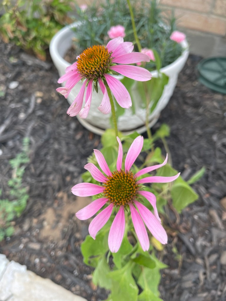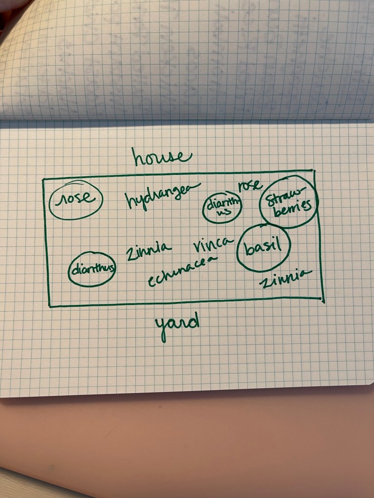 Life isn’t an HGTV episode, and a true cottage garden takes years, but I’ve done what I can with a shoestring budget and the Texas heat. We have lived here for a little over thirty days, and I feel thankful for the progress I’ve made! My first step was to place the containers I already had growing at our rent house into the bed. Eventually, I want it to be mostly plants, but the structure is welcome for now as everything fills in. Two dianthus, a big wide basil, a small pot of vincas, and a galvanized tub of strawberries that will eventually make it’s way to the backyard. Among the planters, I nestled zinnias, echinacea grown from seed, a struggling hydrangea, and a snapdragon.