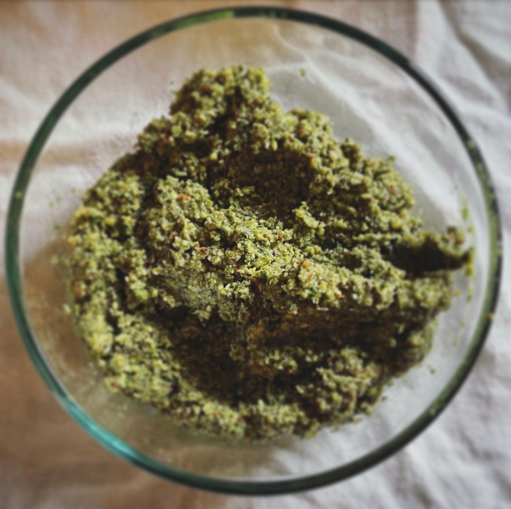 Pulse everything except the olive oil in the food processor until it’s uniformly tiny, then stream the olive oil in as you continue to pulse. Once your pesto is to your desired consistency, serve it over warm pasta with 1/4 cup or so of pasta water to make it really creamy and good.