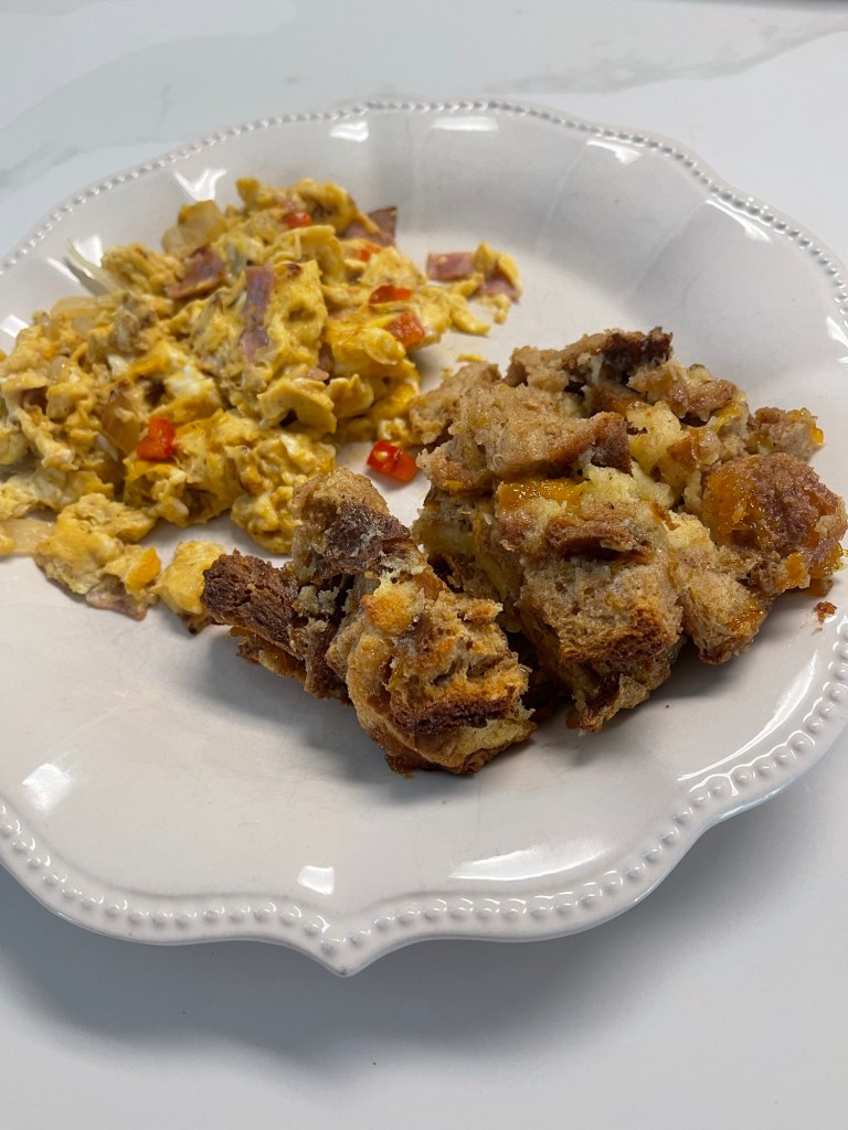 Night One: We had bread pudding with a Denver egg scramble. The bread pudding was sweetened with peach preserves and maple syrup. A Denver egg scramble is my lazy take on my favorite omelet. It has diced bell peppers, onion, ham, and cheddar cheese.