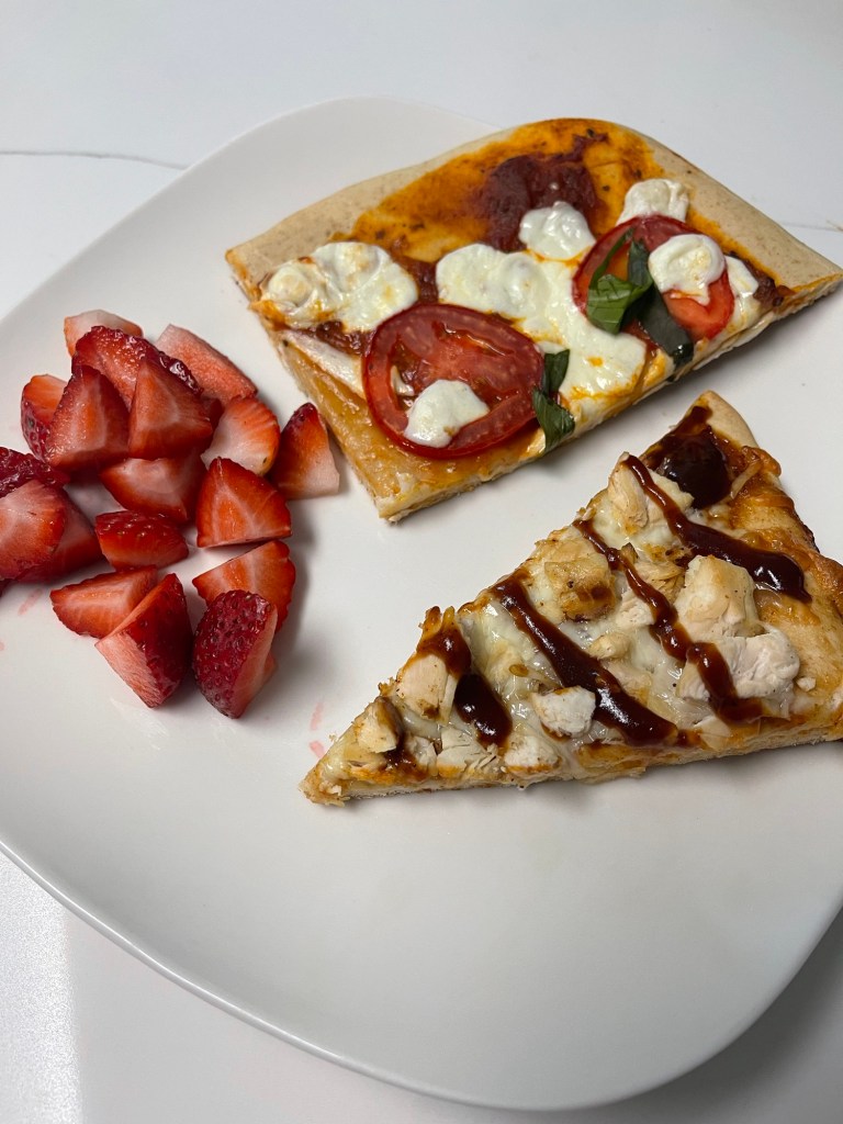 Night Three: Pizza night! I made two kinds: margherita and bbq chicken. They both were a hit, and I served them with fresh strawberries.