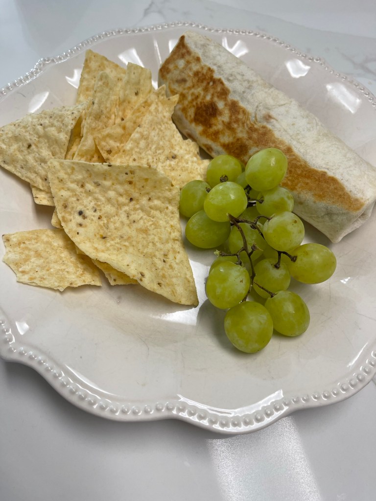 Night Four: This was an unplanned bean burrito night, because my husband was in a car accident, and I had to unexpectedly pack up the kids and go get him off the side of the road. (He’s fine, thank God). We had simple bean burritos, chips, and grapes.