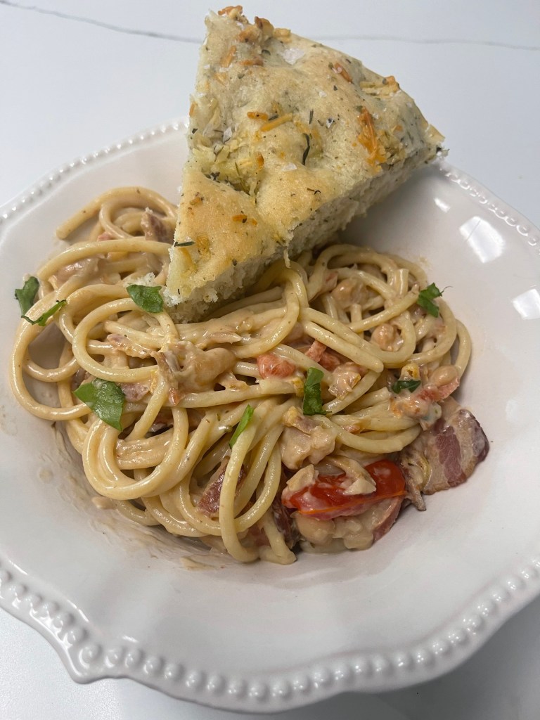 Night Five: I created a random Tuscan-y pasta with bucatini, white beans, shredded carrots, and bacon. I made a simple cream+parm sauce and served it with an herby bread. It was supposed to be a focaccia, but it came out more like a super soft and yummy dinner roll/focaccia hybrid. This was a great budget meal for us because I could use hardly any bacon and still get good flavor.