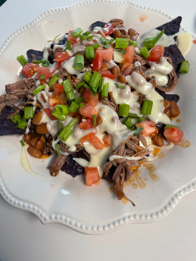 Night One: On this night I cooked a brisket in my instant pot, shredded it up, and served it over chips with a can of ranch pinto beans, a homemade white cheddar cheese sauce, tomatoes, end green onions. Everyone loved this and it was filling.
