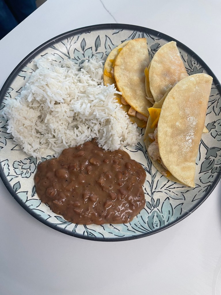 Night Two: We had leftover chicken from another meal, so I chopped it up finely, added a little mild salsa, and used it as a taco filling. Matthew requested steamed white rice, so that’s what we didn’t instead of the more expected Mexican rice as a side.