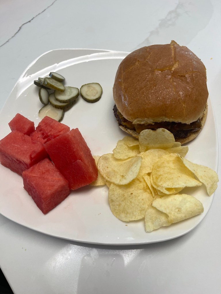 Night Four: My husband was gifted a blackstone grill and wanted to try it out, so he made us the most amazing smash burgers! I paired it with watermelon, chips, and pickles I made about a month ago. This is summer eating at its finest!