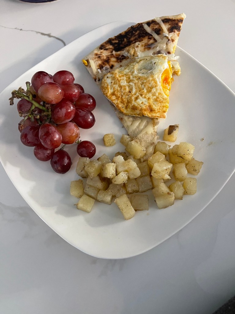 Night Six: Breakfast flatbread, grapes, and potatoes. Another Blackstone recipe! Kinda. It didn’t come out exactly how we had hoped, so it’s still in the tweaking stage. The flatbread was soft, more like a thick and floppy tortilla. I topped them with breakfast sausage, mozzarella cheese, and an over-easy egg. For the potatoes, I seasoned them with my homemade taco seasoning and they were great!
