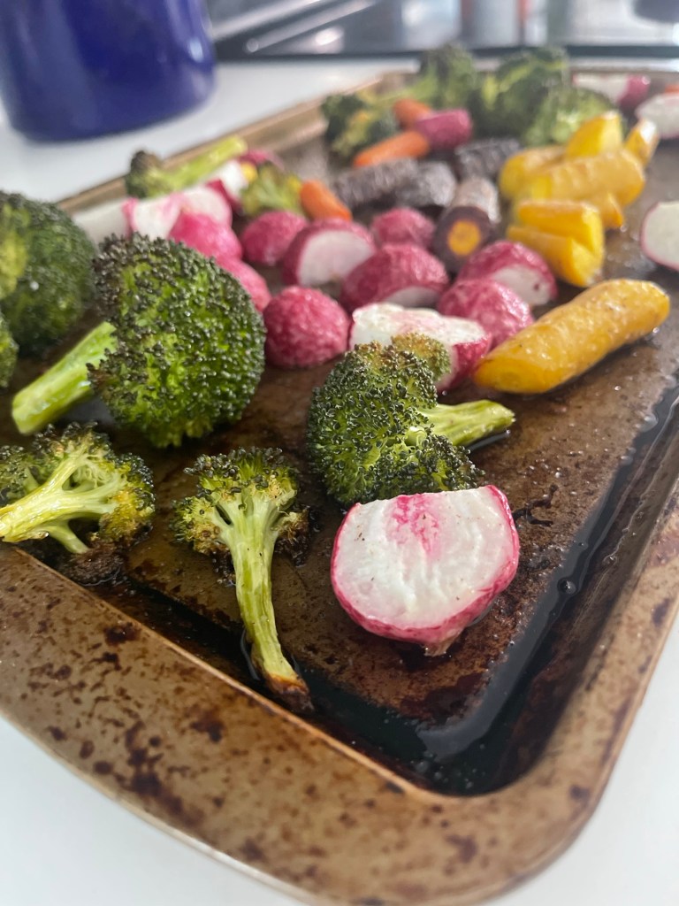 This is my favorite quick side dish to add to a meal, and it could not be easier. Pre-heat your oven to 425, toss your veggies in avocado or olive oil, salt and pepper. Roast for 20-25 minutes and serve. My favorite vegetable to cook this way is broccoli.