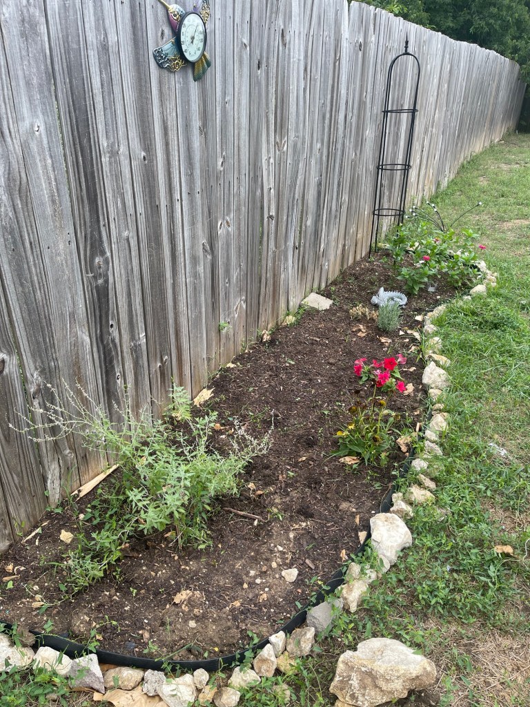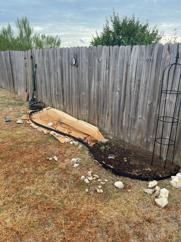 Next I shoveled out the grass, ten minutes at a time. It was so hot during this time, so I wanted to go slow as to not traumatize my children by passing out. This process took a while, and the grass and bindweed started to creep back in after just a few days. I decided to buy some rubber garden border and use that to help the situation. That came in the mail and my husband helped me with the placement of that.