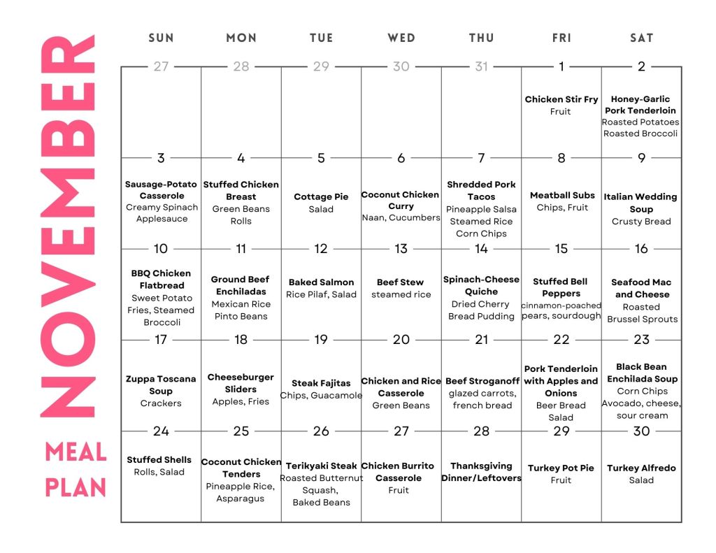 November has my all-time favorite meal: Thanksgiving dinner! For all the other days, I happily eat all the seasonal brassicas, squash, apples, and pears. November in Texas can be heavy-coat cold or air-conditioner warm, so there’s a good balance in this plan to account for that, while still embracing all the cozy fall vibes. I hope ya’ll love this one!