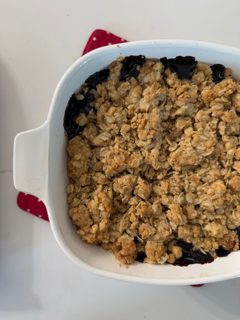 Pre-heat your oven to 375. In a saucepan, bring the filling ingredients up to a boil, then lower to a simmer, stirring frequently. Let it simmer for 20 minutes or so, until thick. You could do a cornstarch slurry if the thickness isn’t to your liking (1/4 cup cool water to 2 T cornstarch, mix then add into the hot filling mixture). Mix the topping ingredients in a small bowl and set aside. Use a square casserole dish (8 by 8 or 9 by 9, it’s about the same for this recipe), and smooth the filling into the bottom. Top with the struesel goodness and bake for 30 minutes. Serve to your family on a weeknight. Impress them all.