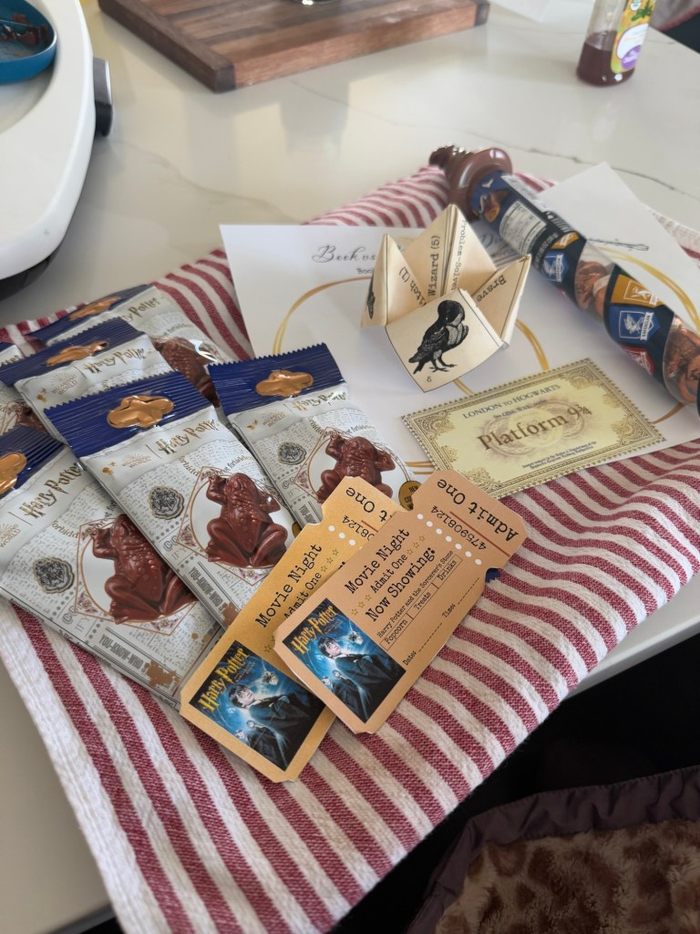 Then, there was the food. Because every great Harry Potter experience needs snacks, right? We had sorting hat chocolates, chocolate frogs, and—of course—big bowls of popcorn. We lit a fire in the living room, turned down the lights, and all snuggled up together, ready to see the magic unfold on screen.