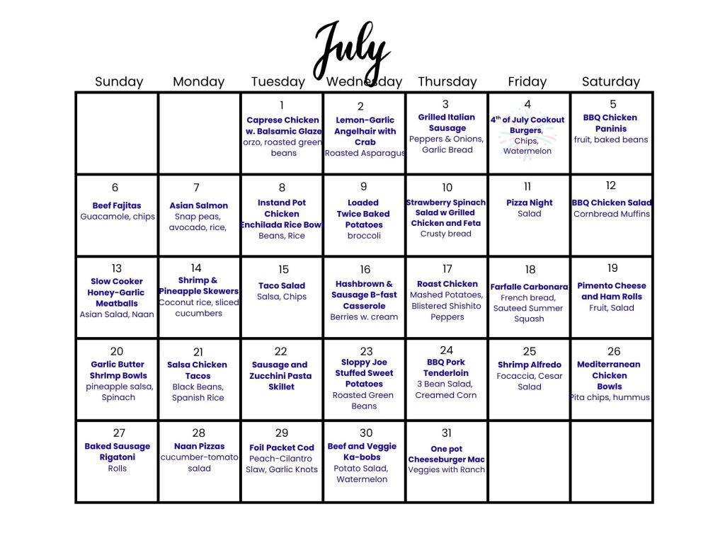 Summer cooking is the hardest for me. Something about the heat just makes me want to serve cereal for dinner and lay around with a glass of lemonade. As the primary cook in our house, however, 100-degree days mean nothing to my hungry kids. I think what I put together for July is the right mix of nutritious, easy, and affordable. Let me know!