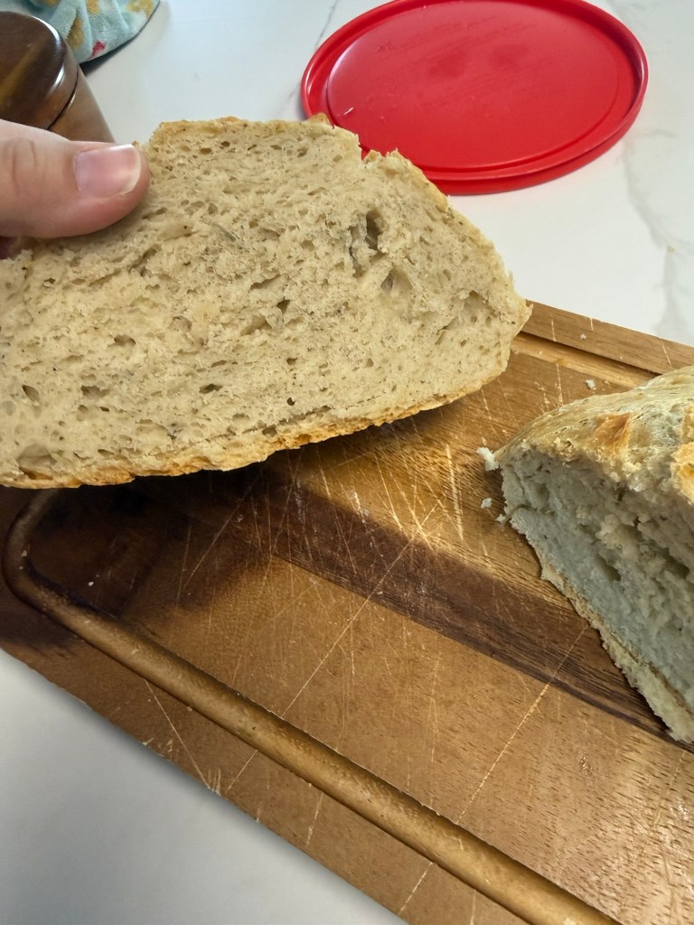 Bloom the yeast in the warm water for about ten minutes. It should be bubbly/foamy at the top of the water. Meanwhile, in a large bowl, mix the flour and salt. If you want to add any herbs/spices, do that now into the dry mix. I’ve done rosemary and garlic a few times with success, but plain salt is great too. Once the yeast has bloomed, mix the water+yeast into the dry mix of flour and salt until combined. The dough will be very wet and shaggy. Cover the bowl of dough with a damp tea towel or cling wrap and let it sit at room temperature for two hours, until doubled in size. it will be bubbly! You can either bake it now or put the bowl into the fridge overnight to develop more flavor. When you’re ready to bake your bread, preheat a covered dutch oven in the oven at 450 degrees for about thirty minutes. Using the least amount of flour possible, gently shape the dough into a general ball/round shape and plop it onto parchment paper. Once the oven is good and hot, take the lid off the dutch oven, place the parchment paper with the dough inside it, and close the lid. Bake for 30 minutes, then take the lid off the dutch oven and bake for 12-15 more minutes. Take the bread out of the dutch oven and let it cool before slicing, if you’re able to wait!