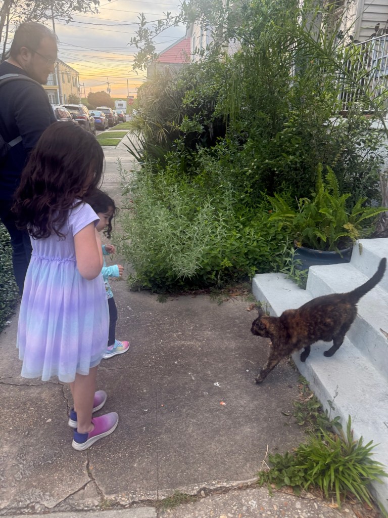 From there, we ate at Nighthawk Pizza, then walked around admiring the colorful homes, many of them built in the 19th century, with that classic New Orleans charm. the kids were excited to see quite a few cats. We ferried back across the river as the sun started to dip, and the French Quarter was just starting to light up for the night.