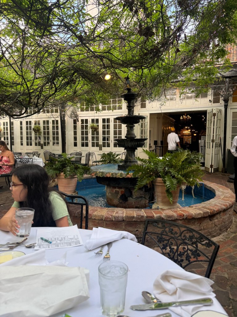 We found a one dollar little art vending machines tucked inside The Court of Two Sisters and decided to stay for dinner. This restaurant dates back to the 1700s, and its courtyard, full of twinkle lights and greenery, and sparrow friends, felt almost frozen in time. I had the best redfish of my life, and we ended with tableside bananas foster, a classic New Orleans dessert created in the French Quarter in the 1950s.